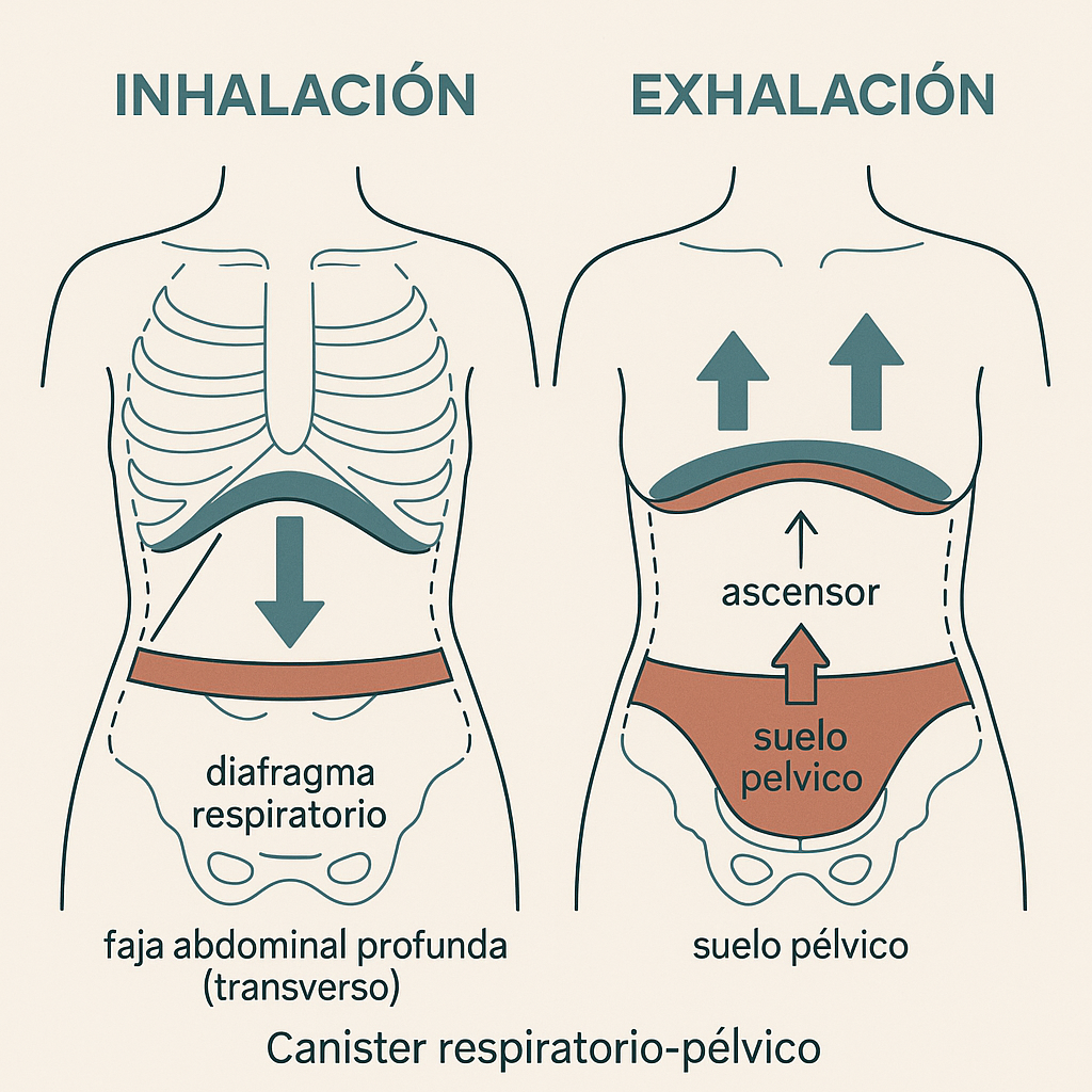El piso pélvico se coordina con el diafragma respiratorio (y otros diafragmas funcionales del core). Al inhalar, el diafragma baja y el piso pélvico acompaña; al exhalar, asciende y puede facilitar la contracción. Esta sinfonía mejora la presión interna y la estabilidad del tronco. En kinesioterapia se usan progresiones que integran diafragma respiratorio, piso pélvico y faja profunda del abdomen para reprogramar el patrón. ScienceDirect+1